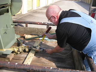 Dave lets some slack out on the come-along so the press can roll back onto the pipes.